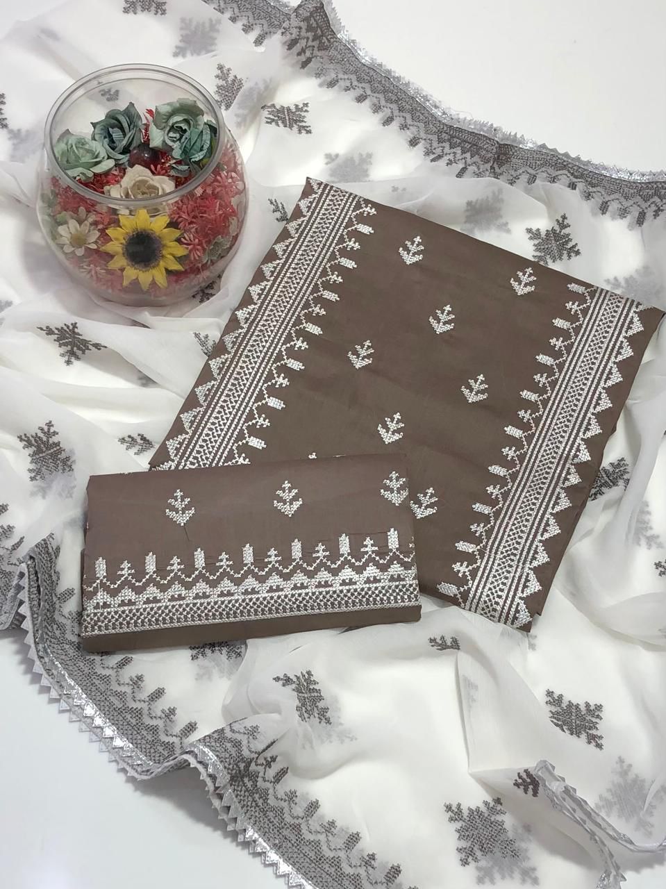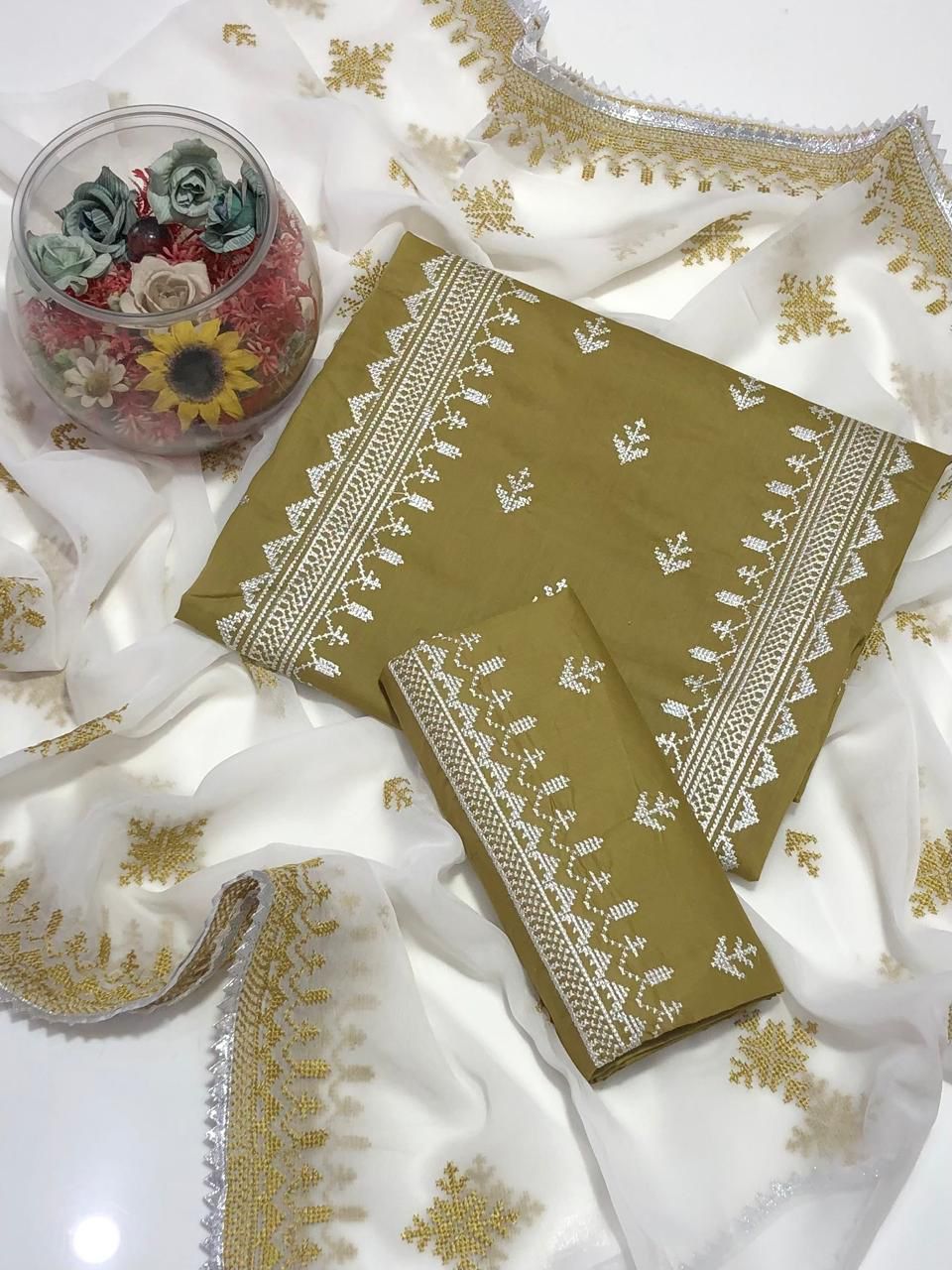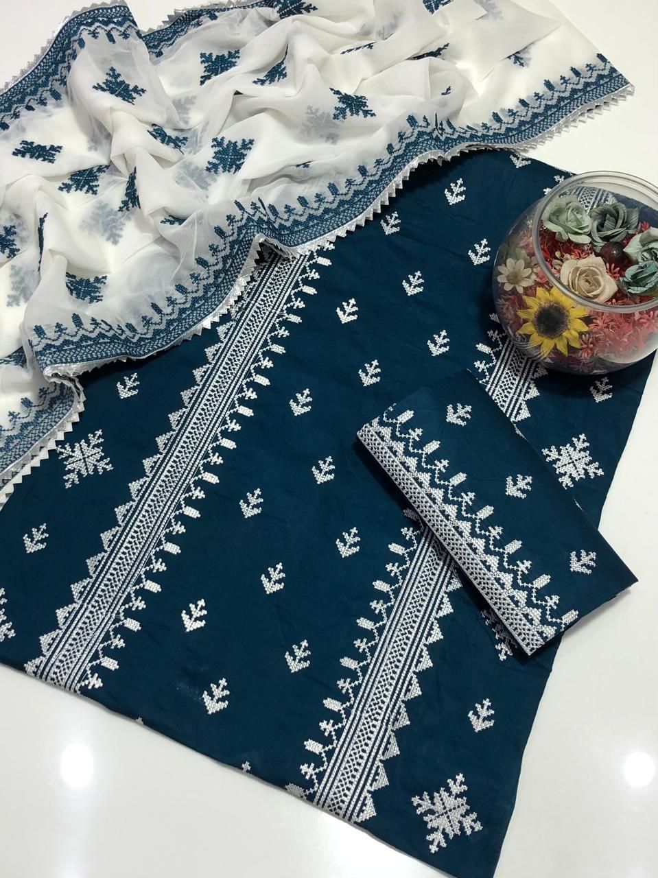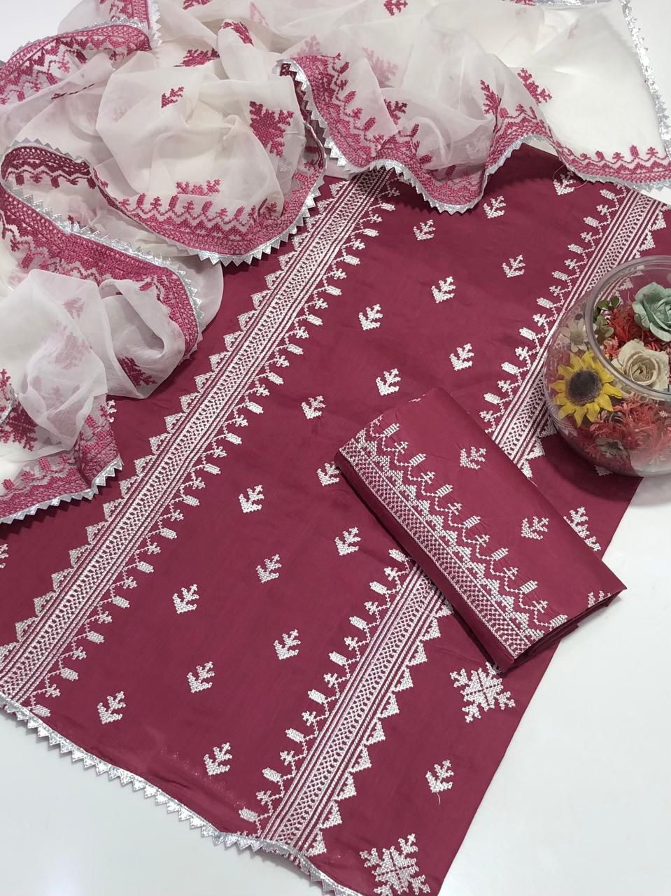 Machine Sequence Embroidery On Shirt With Along Embroidered Trouser Dupatta Embroidered